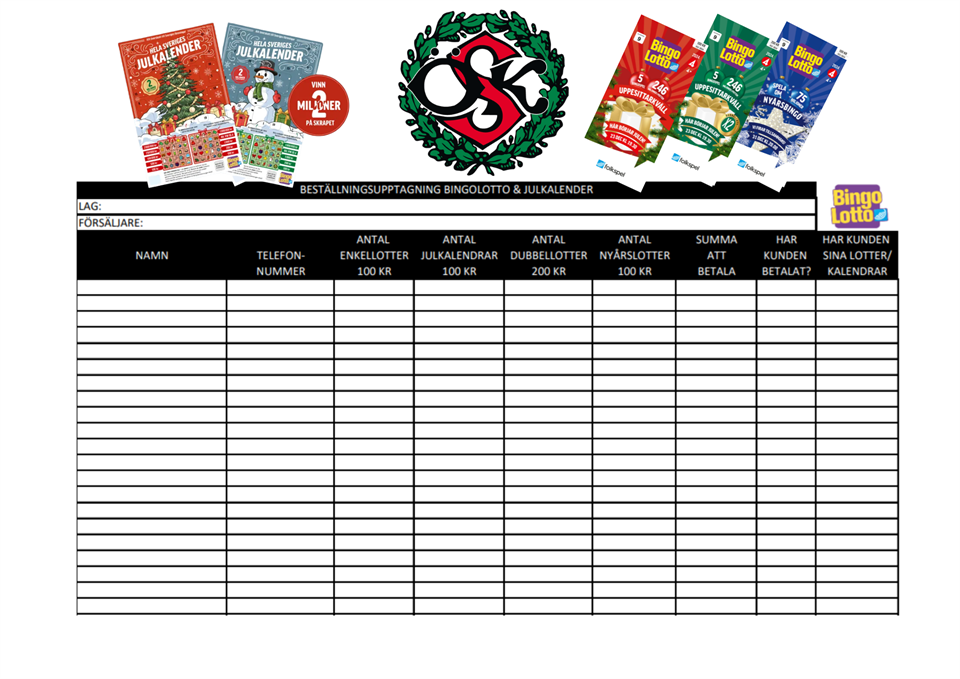 Hej! Nu är det dags att sälja Bingolottos julkalendrar och inom kort även lotter till uppsittarkväll och nyårslotter. Julkalendern kostar 100 kr, förtjänsten till laget är 50 kronor Enkellotter kostar 100 kr, förtjänst 35 kronor Dubbelotter kostar 200 kr, förtjänst 72 kronor Nyårslotter Nyårsafton 100 kr, förtjänst 35 kronor. Den här försäljningen går alltså till den GEMENSAMMA lagkassan, och inte till individuella spelarkassor. Bild för att kunna lägga ut i sociala media kommer. Minimiförsäljning kommer att vara minst 10 kalendrar/lotter. Det kommer också finns möjlighet till friköp, samma som förra året 350 kronor. Förra året sålde vi: 65 kalendrar 192 enkellotter 47 dubbellotter 22 nyårslotter till en vinst för laget på 14 124 kronor. Jag hoppas vi kan göra ännu bör i år! Jag kommer att hämta ut kalendrar under nästa vecka, meddela nedan hur många ni tror er kunna sälja så skickar jag med dem till träning under veckorna framöver. Lotterna kommer att finnas tillgängliga i november. Det kommer finnas möjlighet att lämna åter oöppnade kalendrar/lotter, jag återkommer med information om returer. Hälsningar Freja