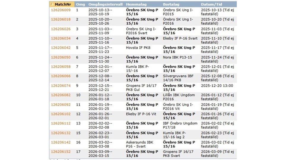 Hej! Tack till alla som var med och jobbade under Örebrocupen Handboll! Vi skriver upp alla som var med så att det blir så rättvist som möjligt med vilka som ska jobba nästa gång, det blir nog inte redan nu med Select Cup i oktober, men definitivt under Örebrocupen Innebandy 17-19 april 2026 (som vi också kommer att spela). Flera tider i oktober att boka in Boka redan nu in lördagen den 4 oktober då kommer det bli föräldramöte i samband med träning. Träningen börjar 08:30 och strax därefter kör vi föräldramöte i ett omklädningsrum eller liknande i Tybblelundshallen. Vi vill helst att minst en vårdnadshavare per spelare är med. Då kommer vi bland annat få veta mycket mer om seriespel, det kommer att starta i vecka 42, troligtvis söndagen den 19 oktober. Se bilden (den är inte så lätt att läsa av tyvärr) med det Fabian har sagt är att de försöker se till att det blir på söndagar framöver. Vi som lag behöver också bestämma om vi tror att vi kan spela fram till den 20 december, men detta kan vi bestämma till föräldramötet. Boka även in onsdagen den 8 oktober kl. 17:30-18:30 då är det Obligatoriska Föreläsningar och det är första gången vårt lag är med. Det kommer att pågå i Örebro Universitet och närmare 1000 personer kommer att delta på runt 10 föreläsningar som pågår parallellt, mer info om det kommer på ÖSK:s hemsida. Vårt lag planerar att gå tillsammans även om den är till för de som är födda i 2015 i första hand, men det är roligare att gå som ett helt lag. Alla föräldrar behöver inte vara med på barnets "föreläsning" (det är mer lek i gymnastikhallen än föreläsning för vårt lag). Vi ser till att det finns minst en ledare som är med. För föräldrar finns en frivillg föreläsning som kommer pågå samtidigt, fast i en annan byggnad. Snart kommer Bingolottos julkalendrar. Eftersom det är mer som börjar kosta nu när vi börjar med seriespel mm så behöver vi få till mer pengar på vår lagkassa. Sixten Hectors mamma, Kerstin, kommer att ha hand om fördelningen. Vi kommer att sälja både julkalendrar och enkellotter i år. Vi vill att alla säljer 5 kalendrar per spelare (100 kr i försäljningspris, av det 50 kr till lagkassan), men sälj gärna även 10 eller fler. Hur mycket enkellotter vi ska sälja är inte bestämt än. Vi ses snart på träningen!