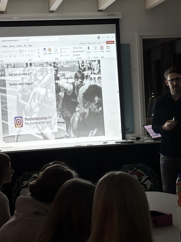 Idag besökte idrottspsykologen, och före detta fotbollsspelaren, Markus oss för en föreläsning med utgångspunkt i psykologin och om vikten av att "Må bra". Han återkom flera gånger till psykologins grunder; känslor, tankar, beteenden. Vad kan man kontrollera? Och vad kan man ev påverka? Vi vill rikta ett stort tack till Markus för viktiga ord och tips som vi tar med oss! Bland annat pratade han om utmaningar som kan finnas inom idrotten (ex höga förväntningar, prestationsångest, skador), fotbollens tre fokusområden ("nästa" aktion, att göra lagkamrater bättre, karriär och framtid), vikten av en gemensam målsättning inom laget och att öva sig i mental träning. Tack Markus och heja oss! Nu ska vi (jobba på att) må bra! /Hälsningar tränarna