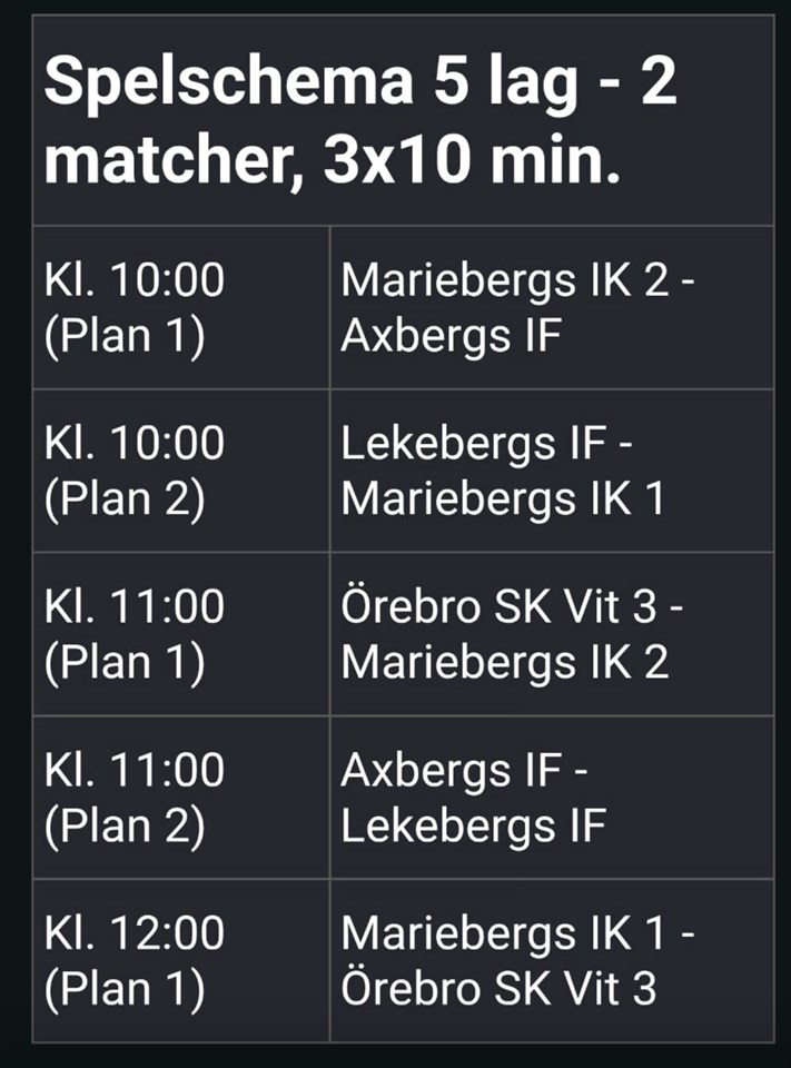 Hej. Nu har vi fått info från Marieberg om matchschema för lördagens poolspel. (Poolspel 3) Samling 10.15 Marieberg IP. Ledare: Fredrik L / Olof Spelare: Assar Diyar Nils Oscar L Oscar G Samuel Tim Elton Ismail Ta med. Benskydd, vattenflaska. Svarta shorts / vita strumpor. Vi har med matchtröjor. Syns på lördag.