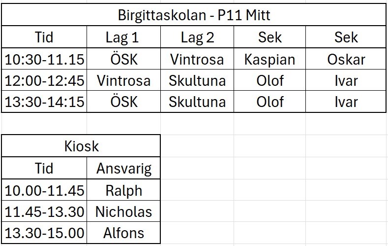 Hej! Ni gör mitt uppdrag med att skapa schema enkelt, stor eloge till ert engagemang och flexibilitet! Bifogat är schemat för lördagens hemma-arrangemang. Utöver schemat så kommer Linnea Nordström och Sonja Zackrisson att baka till kiosken samt att Sonja även transporterar kiosken till Linn. Lycka till och ha så kul! /Mariana