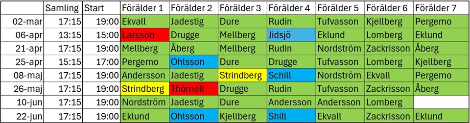 Hej! Återigen, tack för ert engagemang. Bifogat finner ni schemat för hur vi ska bemanna matcherna när ÖSK Fotboll spelar på Bern Arena. Förälder 1: 4h 15min närvaro Förälder 2-7: 2h 15min närvaro Samling för alla 1.45 innan matchstart vid Västra läktaren Färgernas betydelse: Blå, ledare - därav färre pass Grön, bemannar 3/3 av sina pass Gul, bemannar 2/3 av sina pass Röd, bemannar 1/3 av sina pass Som tidigare nämnt så kommer det 8 matcher till så det finns goda möjligheter att få ta fler pass för er som inte hade möjlighet denna gång. (Återkommer så snart jag får mer info) Får man förhinder så ansvarar man själv för att lösa med ersättare. /Mariana Jadestig