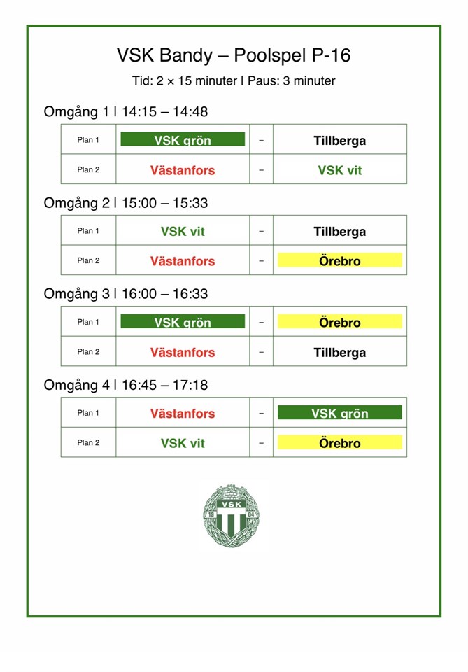 Samling 14:15 i Västerås Info från arrangören: Välkomna till lördagens poolspel på Salboheds Arena, Västerås. Bifogat finner ni spelschema. Ni kommer få tillgång till omklädningsrum och får reda på vilket när ni är på plats, troligen blir det i det lilla huset på kortsidan av Salboheds Arena. Kiosk med grillad korv, hamburgare och hembakt fika kommer att finnas. Det ska bli spännande för alla att testa 7-mannaspel.