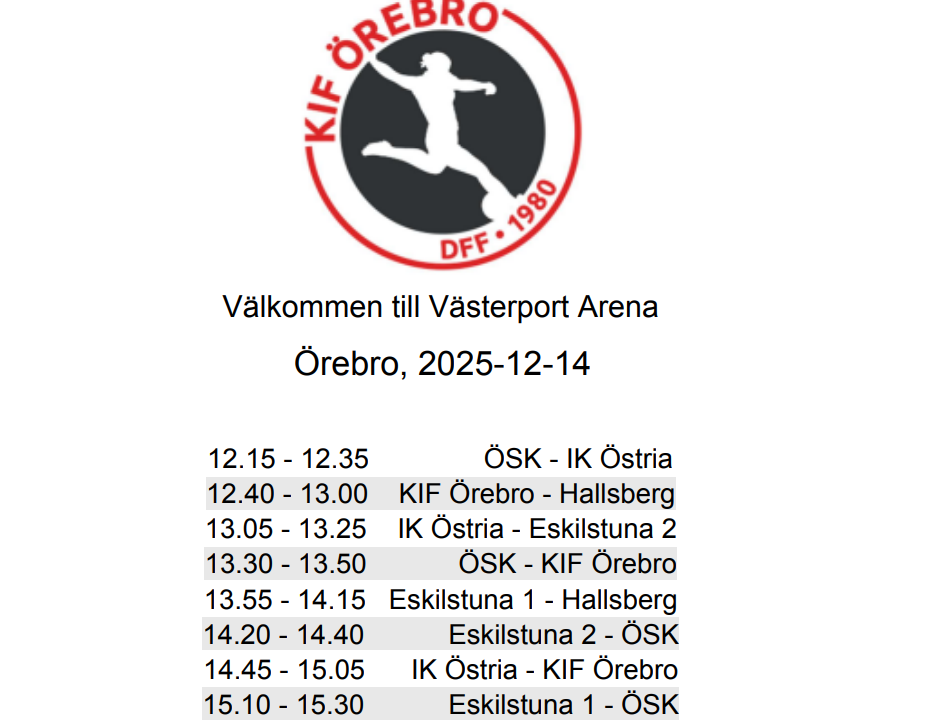 Vi vill tacka för en rolig höst tillsammans med många matcher, Halloweencup och försäljningar. Tack till er alla som hjälpt till att sälja kakor, bemannat kiosker, dragit fram och tillbaka mål och pumpat bollar! Tack också till sponsorerna som bidragit tilll vår lagkassa. Här följer lite information om vad som gäller kommande veckor: • Sista träningen för hösten är nu på söndag den 14 december. Sedan tar vi julledigt fram till onsdagen den 7 januari då vi ses igen på träning. Detta är även sista tillfället att lämna tillbaka eventuella osålda bingolotter eller Bingokalendrar . • Offentlig försäljning av bingolotter den 23 december kl. 12-14 på Vågen Galleria. David (Olivia L.s pappa) och Kenan (Ajlas pappa) har sagt att de kan stå tillsammans med Olivia och Ajla. Om ytterligare något/några barn vill stå kan ni höra av er till David 070-687 61 56. Enligt önskemål från Vågen ska det dock inte vara fler än kanske 2-4 barn totalt. • Örebrocupen Futsal spelar vi den 30 december. Samling ca kl. 12 och vi spelar samtliga matcher i Idrottshuset mellan ca 12:30-17:00. ÖSK kommer behöva ta en entré på 50kr/person för publik likt tidigare år och de tar Swish och kontanter (då Swish har en förmåga att kunna ligga nere så får man gärna ha en liten peng i reserv så slipper man gå upp på stan för att ta ut). Mer information kommer ni kunna se i kallelsen (exempelvis tid och plats för samling och matcher). • Föräldrajobb 30 december mellan kl. 18-20. Vårt lag har fått i uppdrag att vara med och slutstäda på Idrottshuset. Endast 4 barns föräldrar har tackat ja till detta, men 15 stycken barn ska vara med och spela matcherna samma dag. Kika gärna över och se om ni kan vara med och hjälpa till då detta är ett av de uppdrag vi som lag i föreningen behöver hjälpa till och ställa upp med. • Kommande föräldrajobb 17 april på Örebrocupen Innebandy. Påminner igen om att ni kan boka in datum för detta redan nu. Önskar er alla en God Jul och Gott Nytt År om vi inte ses mer förrän nästa år. Vi siktar på att köra några träningsmatcher på ett par söndagsträningar framöver efter nyår. Ta hand om er och har ni några funderingar över något går det bra att höra av sig (Jonna 070 874 20 91)! MVH Alexander, Feisal, Thom och Jonna