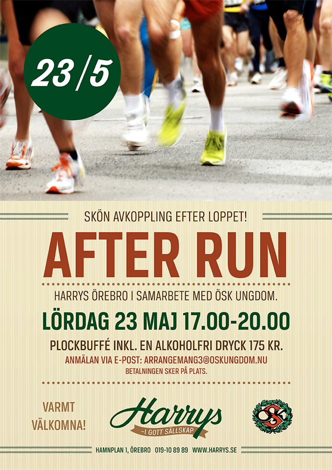 Efter en lång och härlig dag av löpning, grillning och massvis med aktiviteter där barnen står i centrum på Ekängs IP, vill ÖSK Ungdom tillsammans med en av loppets sponsorer - Harrys - bjuda in till en trevlig kväll för alla våra vuxna medlemmar, föräldrar, sponsorer samt andra vuxna deltagare i loppet! Vad? AFTER RUN i samarbete med ÖSK Ungdom och Harrys När? Lördagen den 23 maj mellan 17.00-20.00 Pris? Plockbuffé samt en alkoholfri dryck för 175:-/person Anmälan? Anmälan görs via mejl till arrangemang3@oskungdom.nu. Betalning sker på plats. Efter 20.00 öppnas verandan även upp för allmänheten. Då finns det givetvis möjlighet att stanna kvar och fortsätta njuta av en trevlig kväll! Skynda och anmäl, max 100 personer tas emot - Först till kvarn gäller! VARMT VÄLKOMNA!