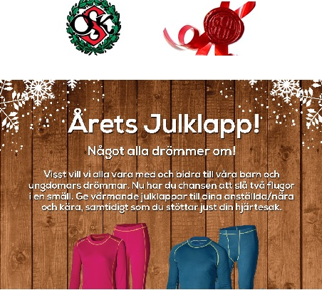 Vill Ni stötta våra barn och ungdomar i Örebro SK Ungdom och Barncancerfonden. Köp vårt uppskattade julpaket så har du den självklara julklappen att ge till dina anställda, kunder eller familj. Förtjänsten går oavkortat till barn och ungdomsverksamheten och Barncancerfonden. Innehåll i julpaketet: • Jubileumsbok Örebro SK • 2 st bingolotter till uppesittarkvällen den 23 december • Aladdin chokladask • Glögg (alkoholfri) • Julmust Kostnad: 250 kr (värde 375 kr) För mer information, kontakta: Gabriel Åbom 019-209560 marknad@oskungdom.nu Sara Larsson Ullbrand 019-209561 arrangemang3@oskungdom.nu