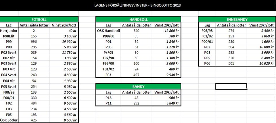 Efter otroliga insatser av våra lag under december månad är den ekonomiska sammanställningen nu klar! Fortfarande är det några lag som har ett fåtal oredovisade lotter, men med dessa inräknade har vi äntligen ett färdigt resultat då det gäller lagens förtjänster under BingoLottoaktiviteten! Klicka på bilden till höger för att förstora upp den och se sammanställningen lag-för-lag! Idag för klubbens ekonomiansvarige Mattias Norgren över lagets vinster från sålda lotter till lagens ekonomirapporter, därefter är det bara att njuta av de stärkta lagkassorna. Nästa steg i efterarbetet blir att räkna ut antalet sålda lotter/deltagare på laglistan för att kora 2013 års vinnarlag av försäljningstävlingen! Vilka blir det som tar hem en Bowlingkväll och biokväll för hela laget? Håll utkik! Bra jobbat alla! MVH Ted Larsson