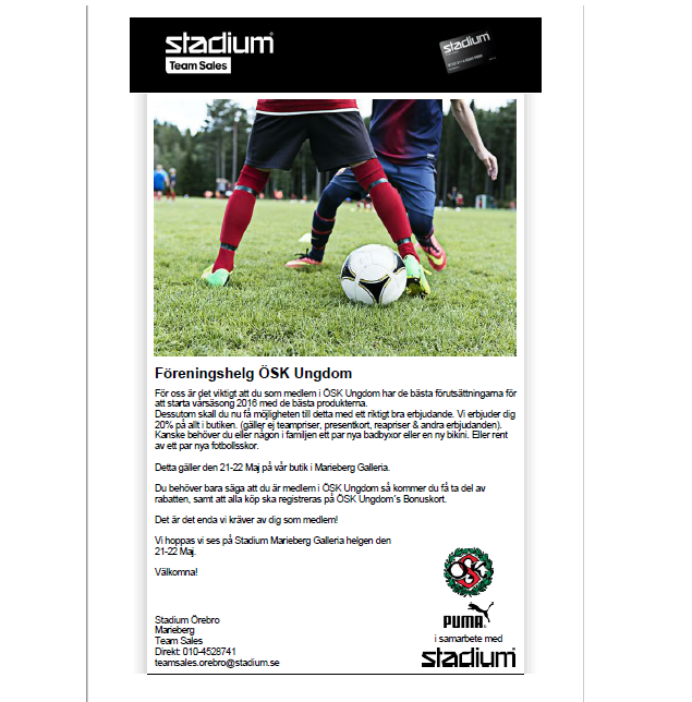 I samband med helgens ÖSK-lopp så erbjuder Stadium Marieberg en föreningshelg för Örebro SK Ungdom. Det är viktigt att alla våra medlemmar får de bästa förutsättningarna. Stadium Marieberg erbjuder därför 20% på allt i butiken (gäller ej teampriser, presentkort, reapriser och andra erbjudanden). Detta gäller alltså 21-22 maj i Stadiums butik i Marieberg Galleria. Man behöver bara säga att man är medlem i Örebro SK Ungdom så kommer man få ta del av rabatten, samt att alla köp som görs denna kväll kommer generera bonus till vår förening. Varmt Välkomna, hälsar Stadium Marieberg Örebro!