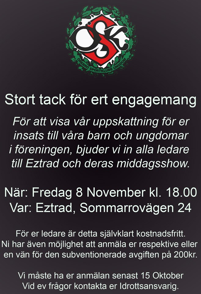 För att visa vår uppskattning för er insats till våra barn och ungdomar i föreningen, bjuder vi in alla våra ledare till Eztrad och deras middagsshow.